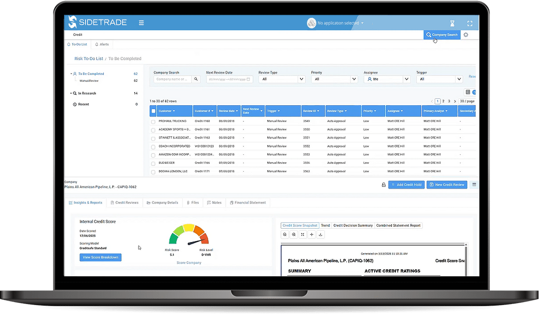 Sidetrade’s AI-driven credit decisioning and monitoring app unifies real payment behavior, bureau and CRA data, and internal exposure into a single risk view.