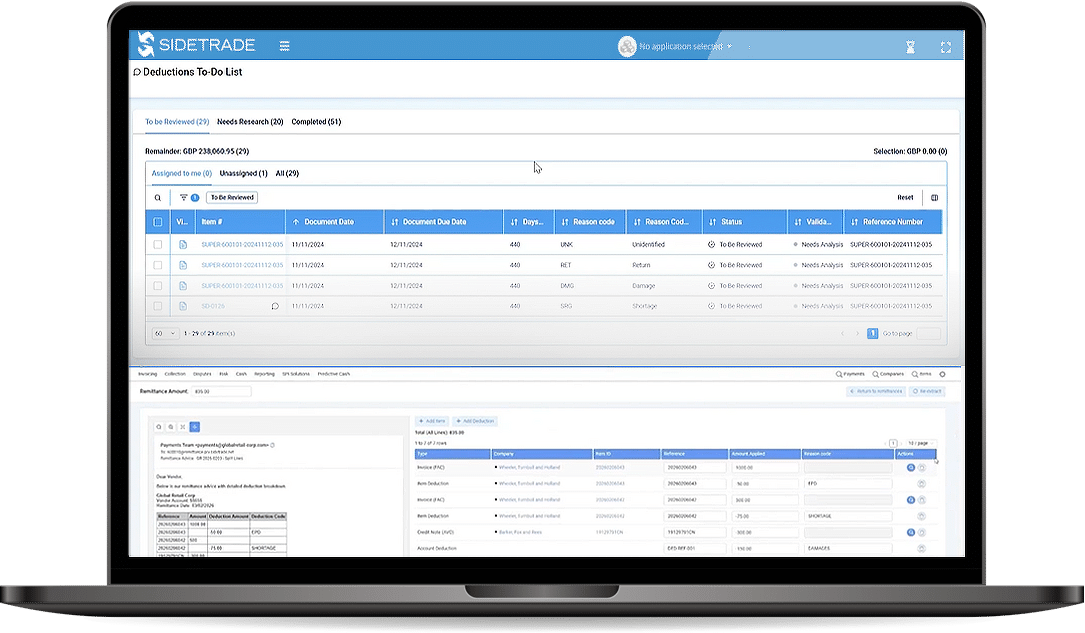 Sidetrade uses AI-driven data processing to detect deductions from incoming payments, remittances, and customer communications. It captures and classifies deduction information in real time, consolidating data from multiple sources into a unified view for faster resolution.